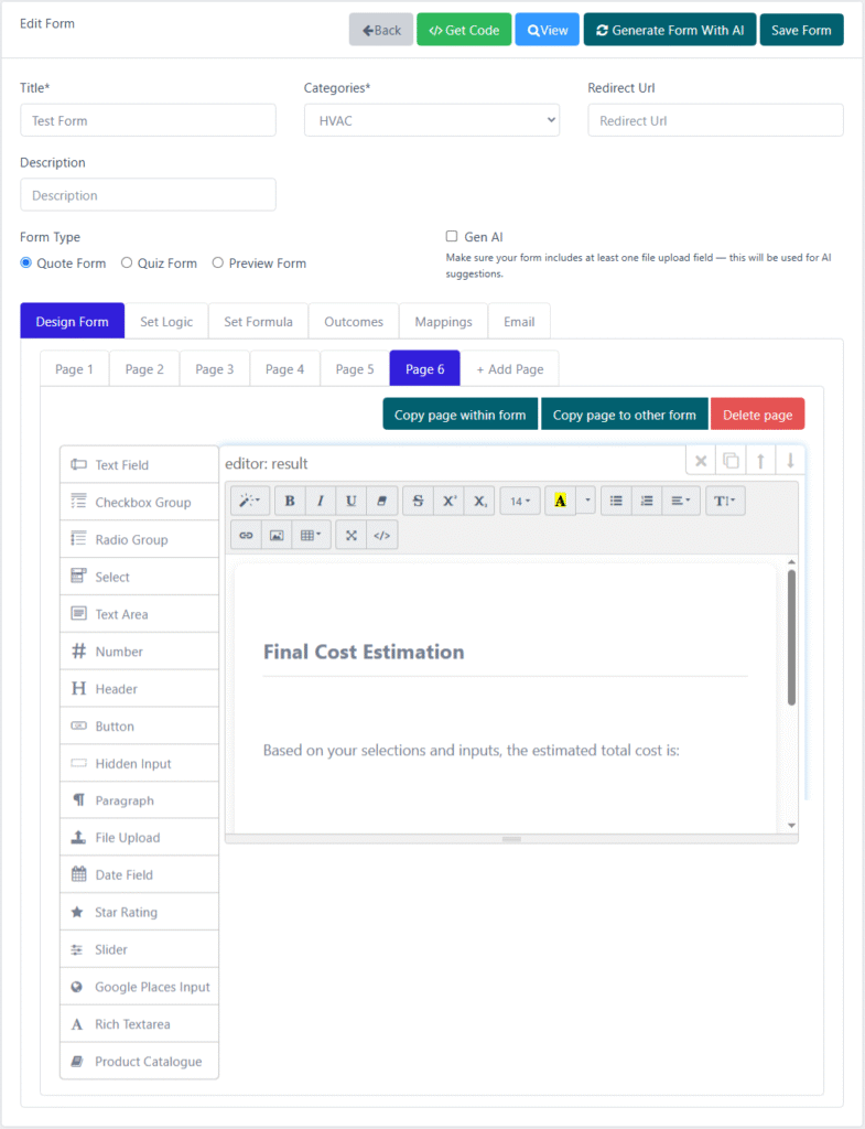 Once the prompt is submitted, the system processes the request and automatically refreshes the page with a fully generated form. All fields, pages, and layouts appear instantly inside the builder, exactly as if they were manually assembled. This includes text inputs, dropdowns, number fields, buttons, headers, rich text blocks, and more — fully arranged and ready for editing.